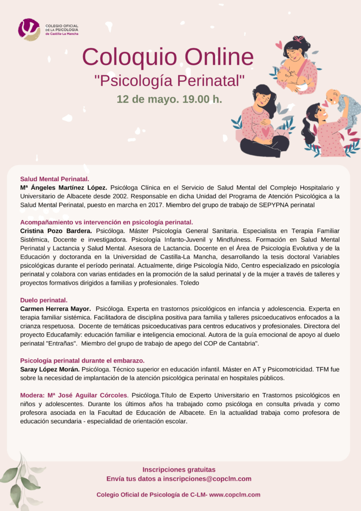 Dentro de las actividades programadas en el Plan de Formación 2021-2022 del Colegio Oficial de la Psicología de Castilla-La Mancha, el jueves 12 de mayo de 2022, a las 19:00 horas, tendrá lugar el Coloquio on line denominado “Psicología perinatal”