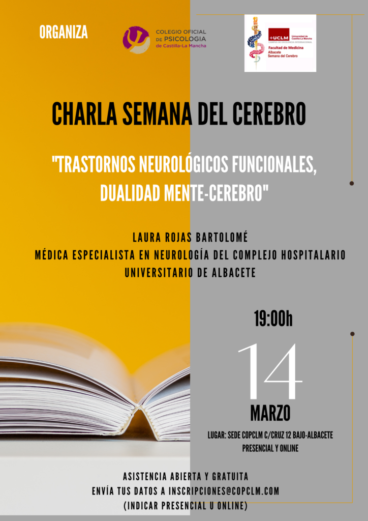 Dentro de las actividades de la Semana del Cerebro, organizadas por la Universidad de Castilla-La Mancha, y en las que de nuevo colabora el Colegio Oficial de la Psicología de Castilla-La Mancha, el martes 14 de marzo de 2023 tendrá lugar la charla “Trastornos Neurológicos Funcionales, Dualidad Mente-Cerebro”