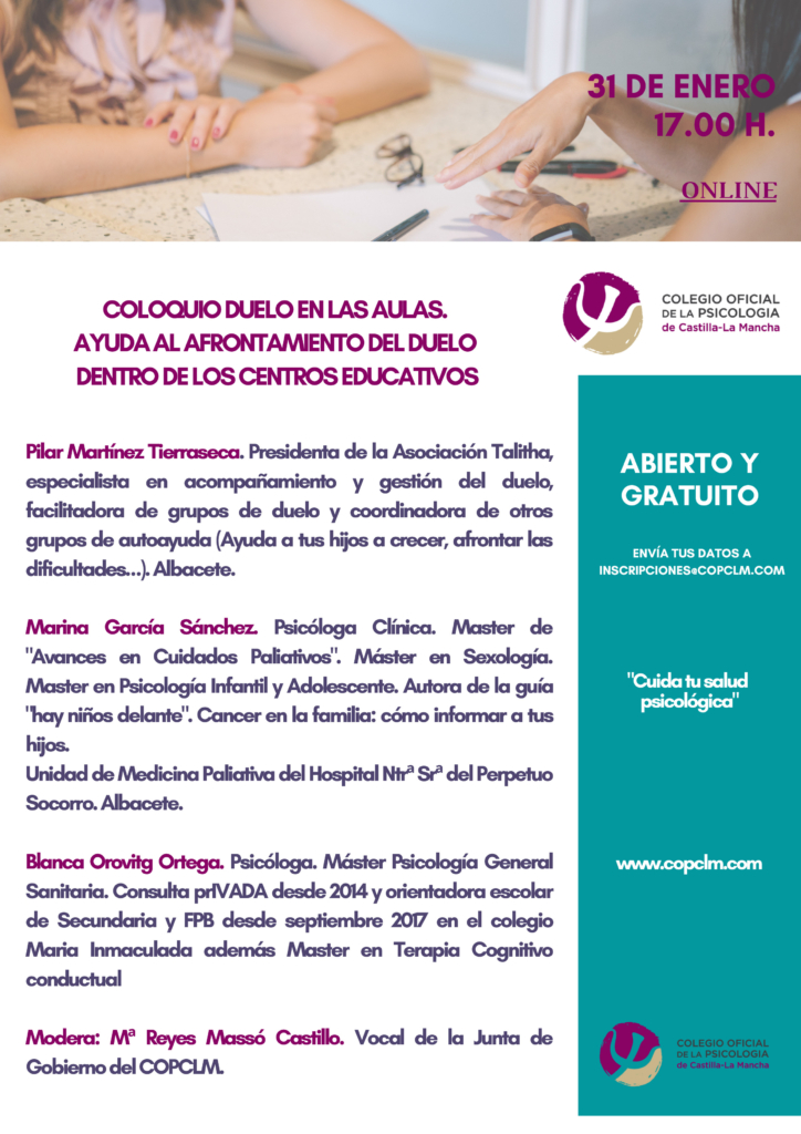Dentro de las actividades programadas en el Plan de Formación 2021-2022 del Colegio Oficial de la Psicología de Castilla-La Mancha, el lunes, 31 de enero de 2022, a las 17:00 horas, tendrá lugar, el Coloquio de Psicología “Duelo en las aulas”.