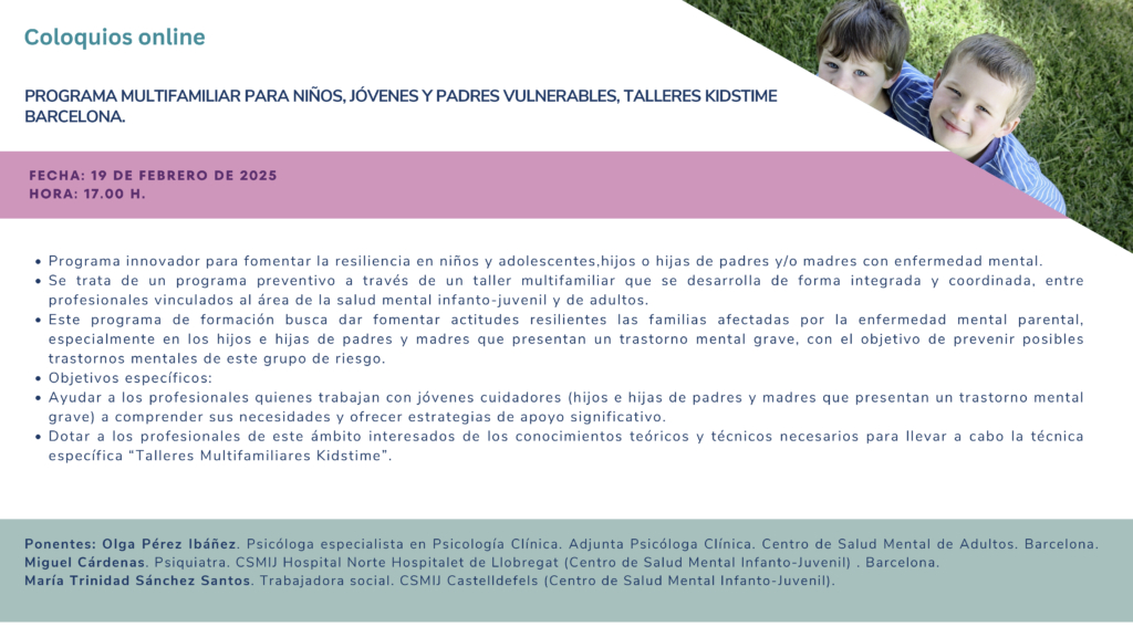 Coloquio on line: Programa multifamiliar para niños, jóvenes y padres vulnerables. Talleres Kidstime Barcelona