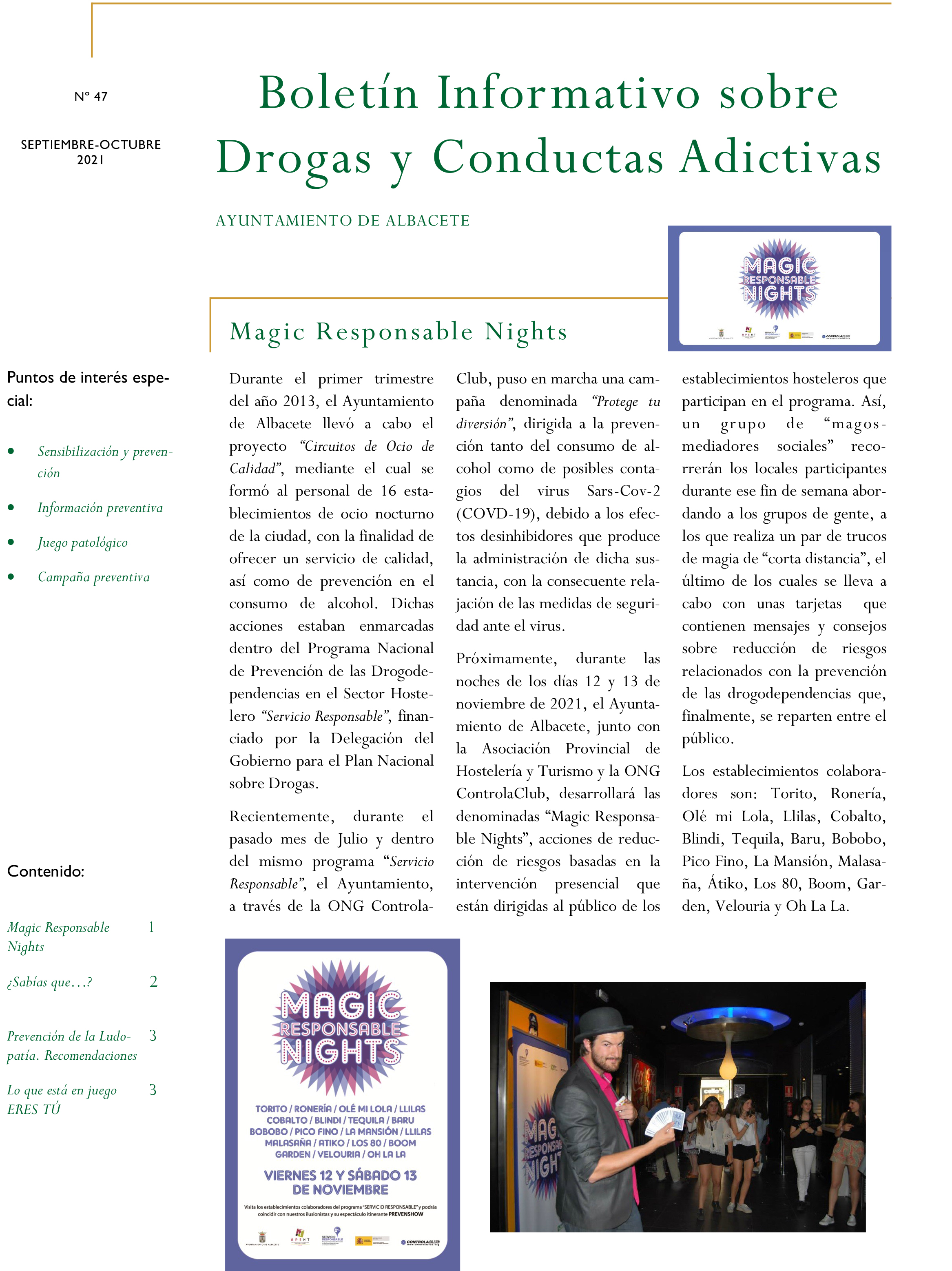 El Ayuntamiento de Albacete nos remite su Boletín Nº 47, correspondiente a los meses de septiembre y octubre de 2021, sobre Drogodependencias y Conductas Adictivas, en el que se puede encontrar información relativa a las Magic Responsable Nights o la prevención de la Ludopatía, entre otras cosas.