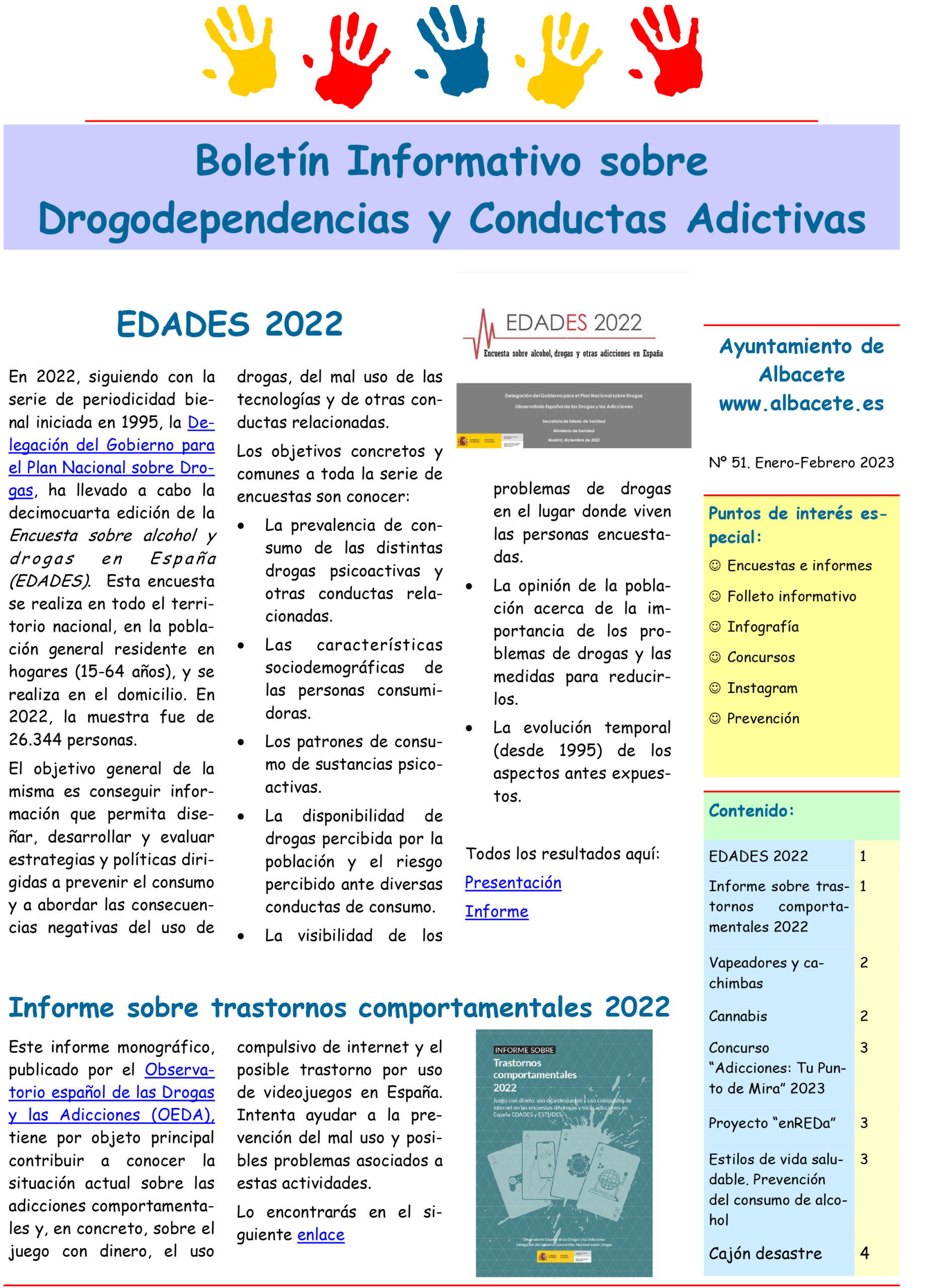 El Ayuntamiento de Albacete nos remite su Boletín Nº 51, correspondiente a los meses de enero y febrero de 2023, sobre Drogodependencias y Conductas Adictivas.