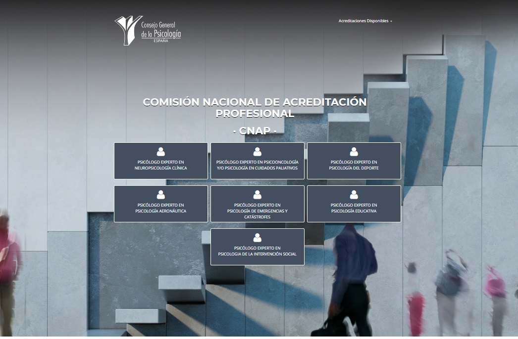 El Consejo General de la Psicología a través de la Comisión Nacional de Acreditaciones Profesionales (CNAP), promueve la acreditación en las Áreas Profesionales de Experto en: Neuropsicología, Psicooncología y Cuidados Paliativos, Psicología del Deporte, Psicología Educativa, Psicología de la Intervención Social y Psicología Aeronáutica.