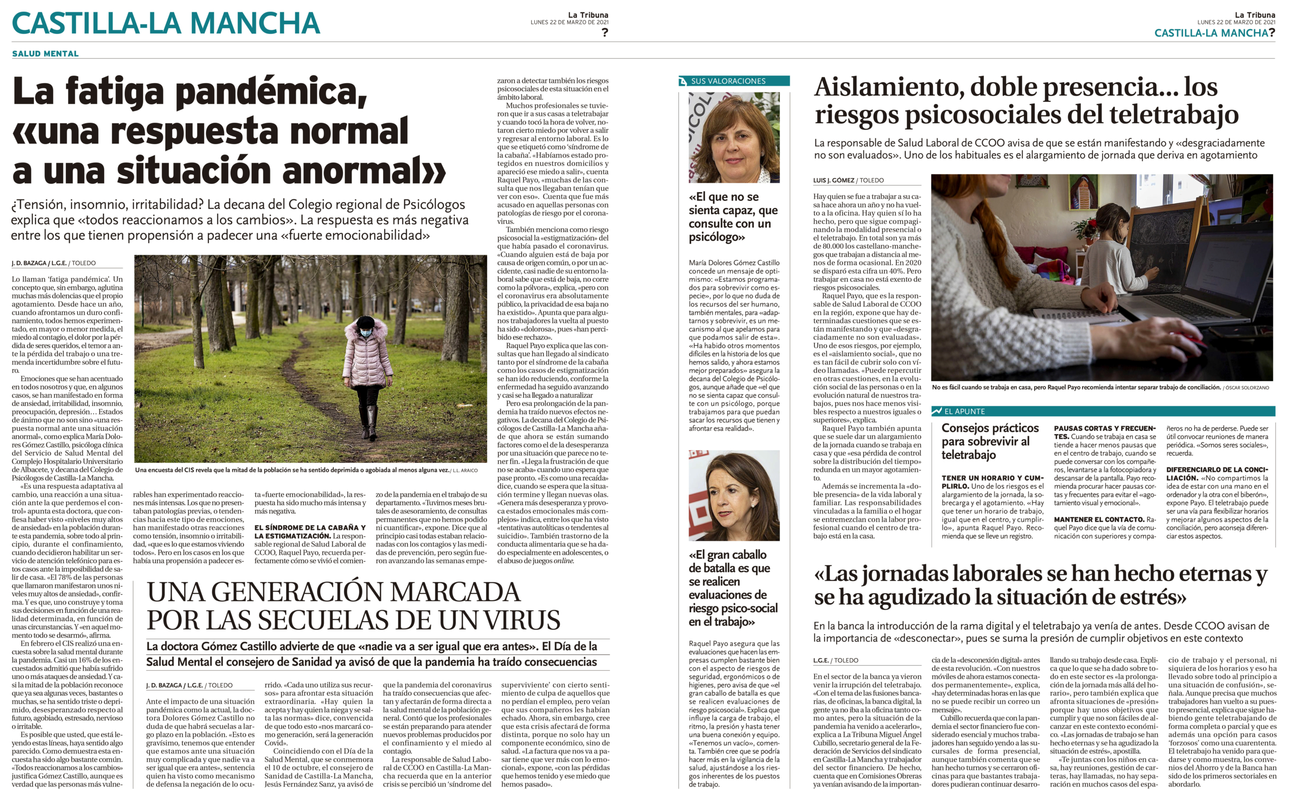 El pasado lunes, 22 de marzo, la Tribuna de Toledo publicaba un reportaje sobre la ya denominada “Fatiga pandémica”, en el que contaron con la opinión profesional de la Decana del Colegio Oficial de la Psicología de Castilla-La Mancha, María Dolores Gómez Castillo.