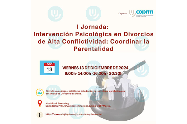 El Colegio Oficial de Psicología de la Región de Murcia, ha organizado la I Jornada “Intervención Psicológica en Divorcios de Alta Conflictividad: Coordinar la Parentalidad”, que tendrá lugar el viernes 13 de diciembre de 2024, de 09:00h a 14:00h y de 16:30h a 20:30h, en modalidad streaming.