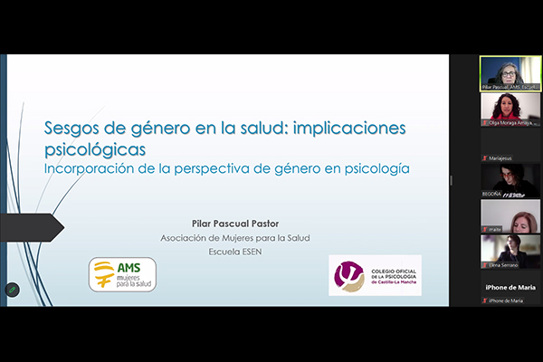 En la tarde del pasado 20 de marzo, se celebró, en modo on line, el coloquio, previsto dentro del plan formativo del COPCLM 2024-2025, “Sesgos de género en salud: Implicaciones psicológicas”, organizado por el Grupo de Trabajo de Psicología e Igualdad de Género del colegio, y moderado por la vicedecana, Olga Moraga Amaya.
