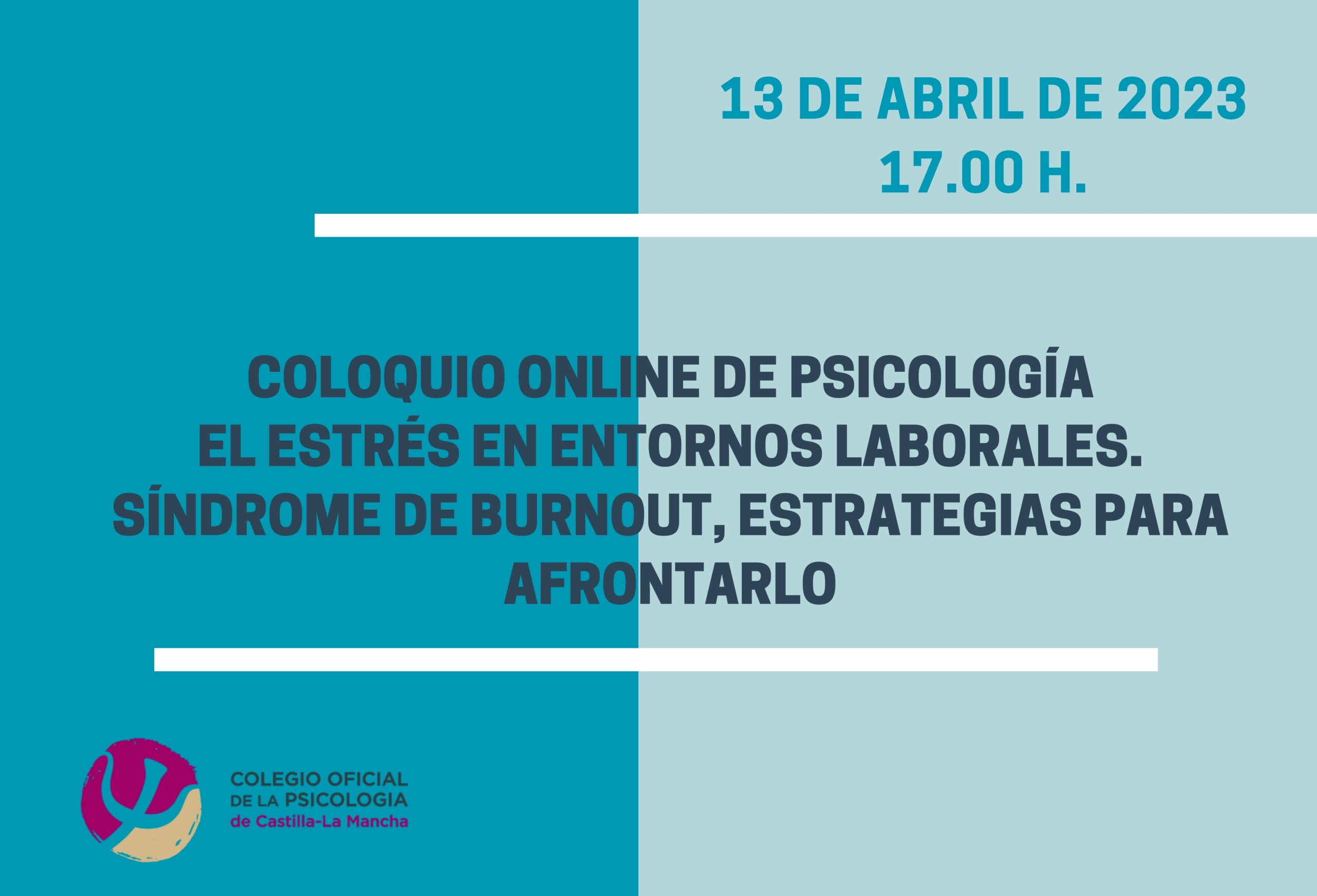 Dentro de las actividades programadas en el Plan de Formación 2022-2023 del Colegio Oficial de la Psicología de Castilla-La Mancha, el jueves 13 de abril de 2023, a las 17:00 horas, tendrá lugar el Coloquio on line denominado “Estrés en entornos laborales. Síndrome de Burnout, estrategias para afrontarlo”.