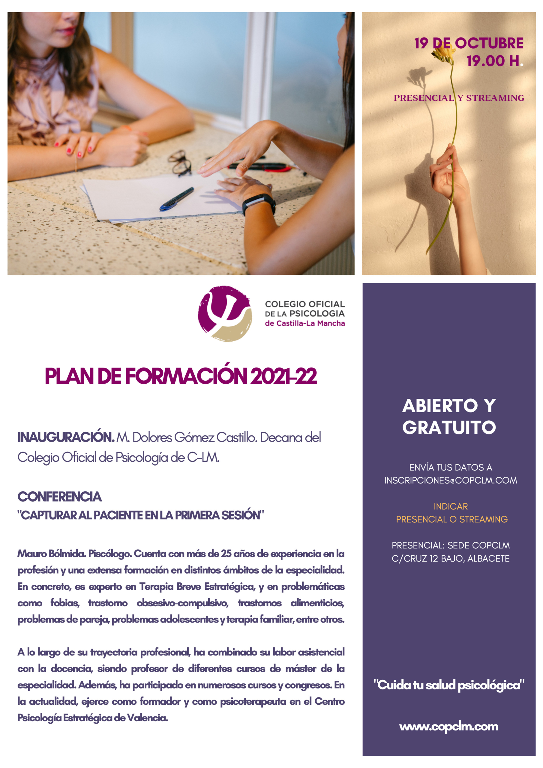 El martes 19 de octubre tendrá lugar, en formatos presencial -en la sede del colegio, C/ Cruz Nº 12-Bajo- y streaming, el acto de inauguración del Plan de Formación 2021/2022 del Colegio Oficial de la Psicología de Castilla-La Mancha.
