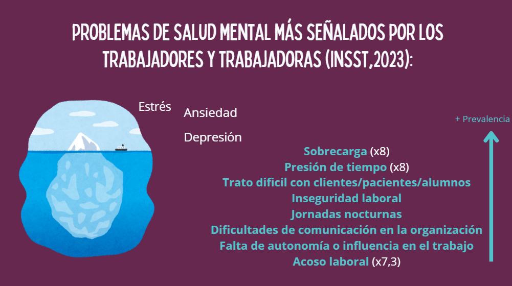 Para iniciar la jornada, que se celebró en el Centro Joven de Guadalajara, se evaluó la presencia de factores que perjudican a la salud mental de las personas trabajadoras en los entornos laborales de las personas participantes (factores como las jornadas a turnos, las jornadas nocturnas, la inseguridad contractual o económica de los puestos de trabajo, las dificultades de comunicación en las organizaciones, etc.). Después se revisaron los datos existentes sobre la salud mental de las personas trabajadoras antes y después de la pandemia COVID-19, y también los últimos datos disponibles a este respecto. Destacó el hecho de que en el año 2023 se batiera el record de bajas laborales por dificultades de salud mental.