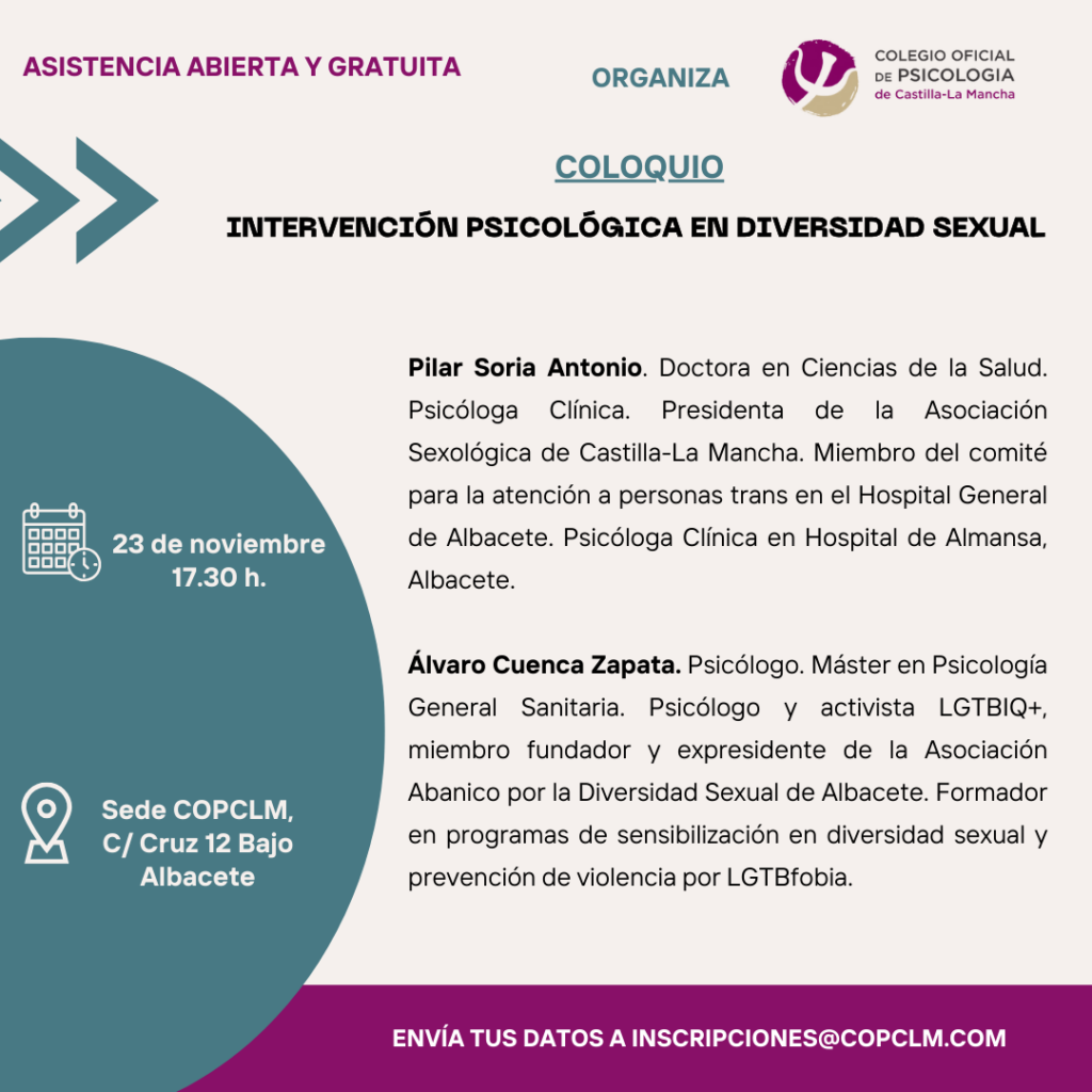 Dentro de las actividades programadas en el Plan de Formación 2023-2024 del Colegio Oficial de la Psicología de Castilla-La Mancha, el jueves 23 de noviembre de 2023, a las 17:30 horas, tendrá lugar el Coloquio denominado “Intervención psicológica en diversidad sexual”