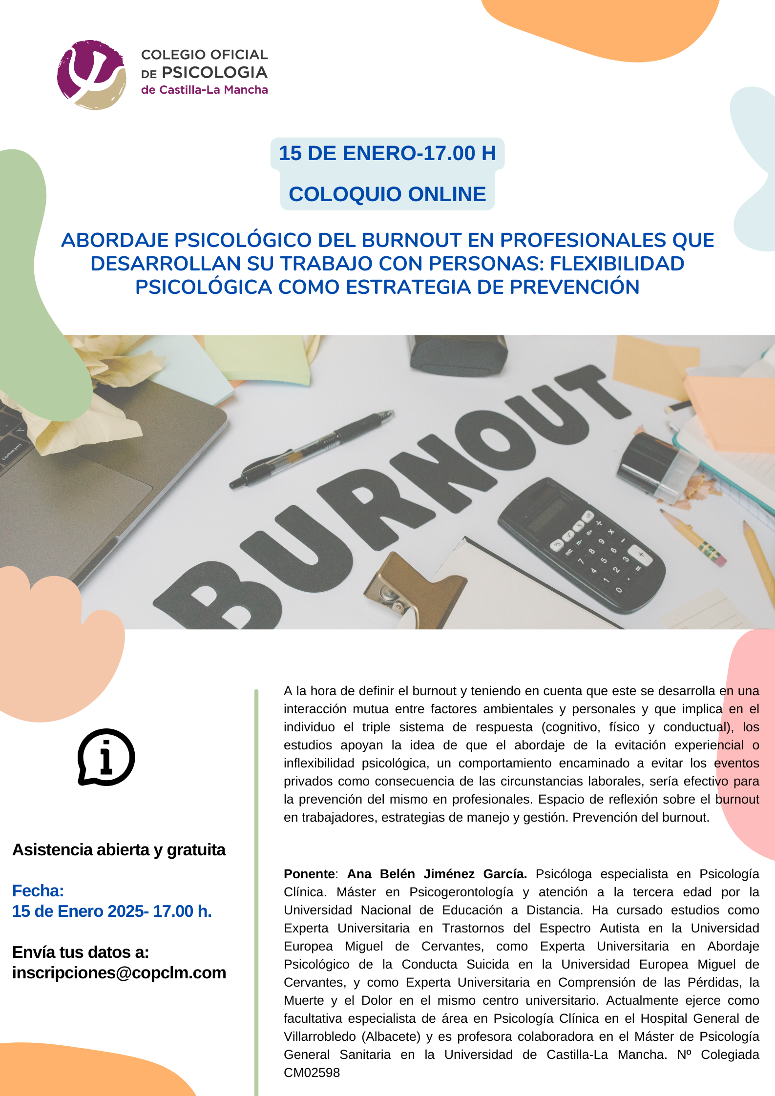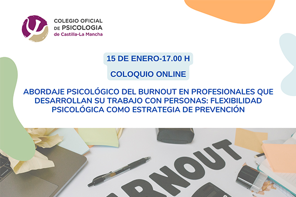 Dentro de las actividades programadas en el Plan de Formación 2024-2025 del Colegio Oficial de Psicología de Castilla-La Mancha, el miércoles 15 de enero, a las 17:00 horas, tendrá lugar el coloquio on line denominado “Abordaje psicológico del Burnout en profesionales que desarrollan su trabajo con personas: Flexibilidad psicológica como estrategia de prevención”.