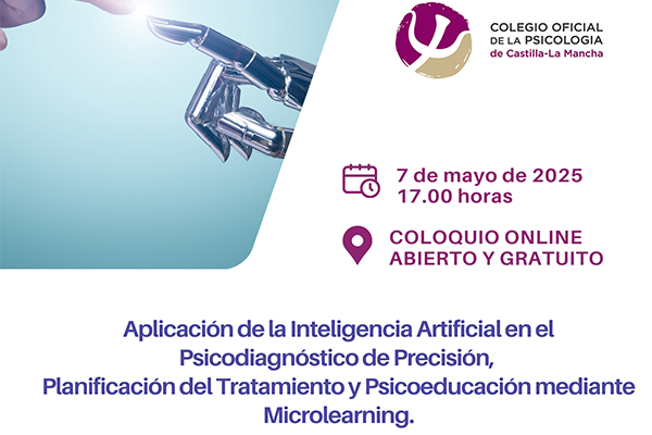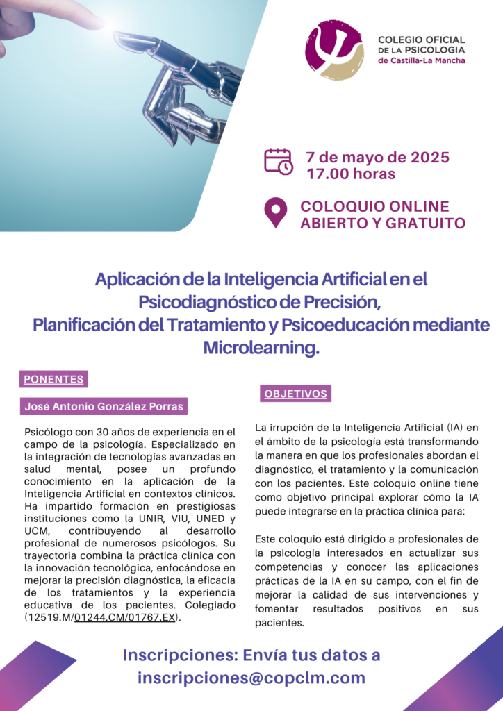 Dentro de las actividades programadas en el Plan de Formación 2024-2025 del Colegio Oficial de Psicología de Castilla-La Mancha, el miércoles 7 de mayo, a las 17:00 horas, tendrá lugar el coloquio on line denominado “Aplicación de la Inteligencia Artificial en el Psicodiagnóstico de Precisión, Planificación del Tratamiento, y Psicoeducación mediante Microlearning”.