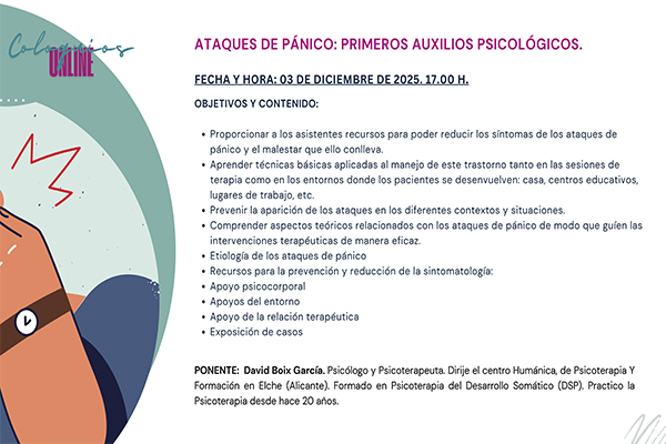 Dentro de las actividades programadas en el Plan de Formación 2025-2026 del Colegio Oficial de Psicología de Castilla-La Mancha, el miércoles 3 de diciembre, a las 17:00 horas, tendrá lugar, en modo on line, el coloquio “Ataques de pánico. Primeros auxilios psicológicos”.