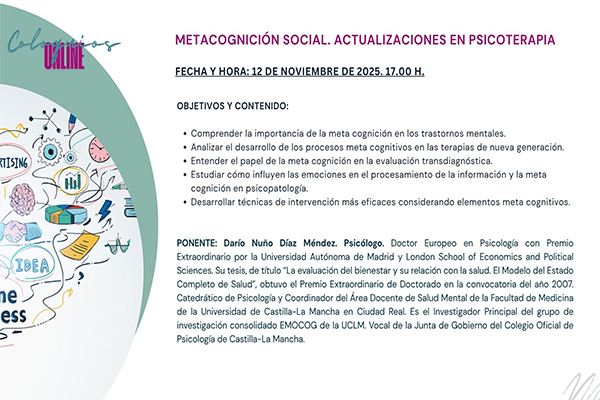 Dentro de las actividades programadas en el Plan de Formación 2025-2026 del Colegio Oficial de Psicología de Castilla-La Mancha, el miércoles 12 de noviembre, a las 17:00 horas, tendrá lugar el coloquio on line denominado “Metacognición social: Actualizaciones en Psicoterapia”.