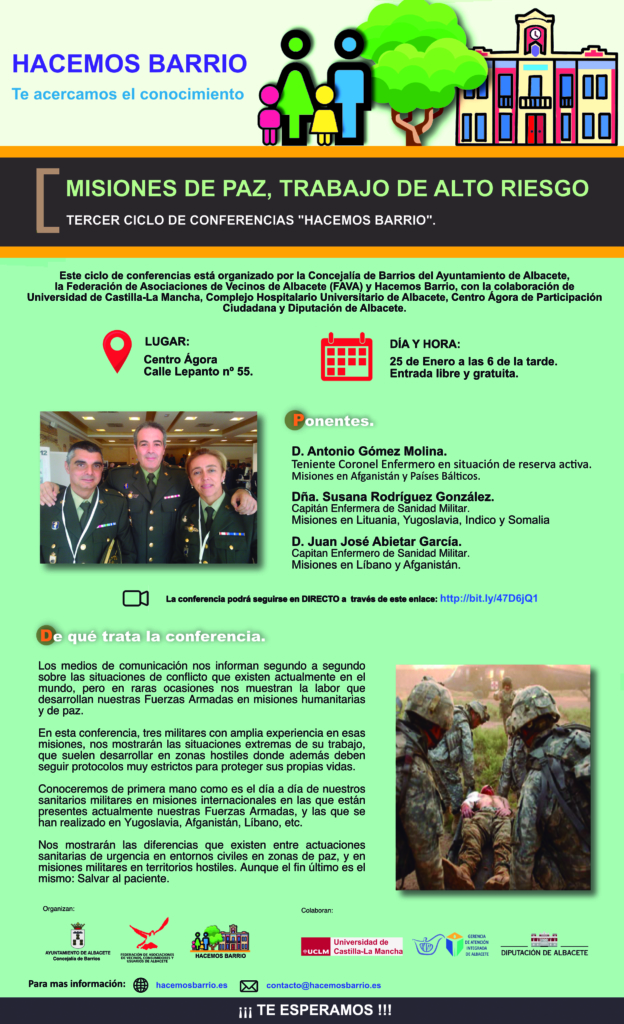 El jueves 25 de enero, a las 18:00 horas, tendrá lugar a través de YouTube la conferencia “Sanidad militar en misiones de paz”, enmarcada en la iniciativa web hacemosbarrio.es