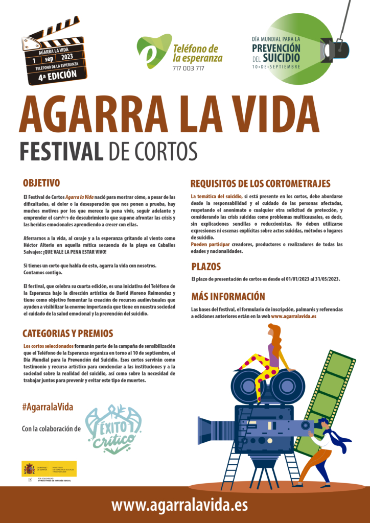 El Teléfono de la Esperanza ha lanzado la convocatoria de la cuarta edición del Festival de Cortos “Agarra la vida” que tiene como objetivo fomentar la creación de recursos audiovisuales que ayuden a visibilizar la enorme importancia que tiene en nuestra sociedad de hoy día el cuidado de la salud emocional y la prevención del suicidio.