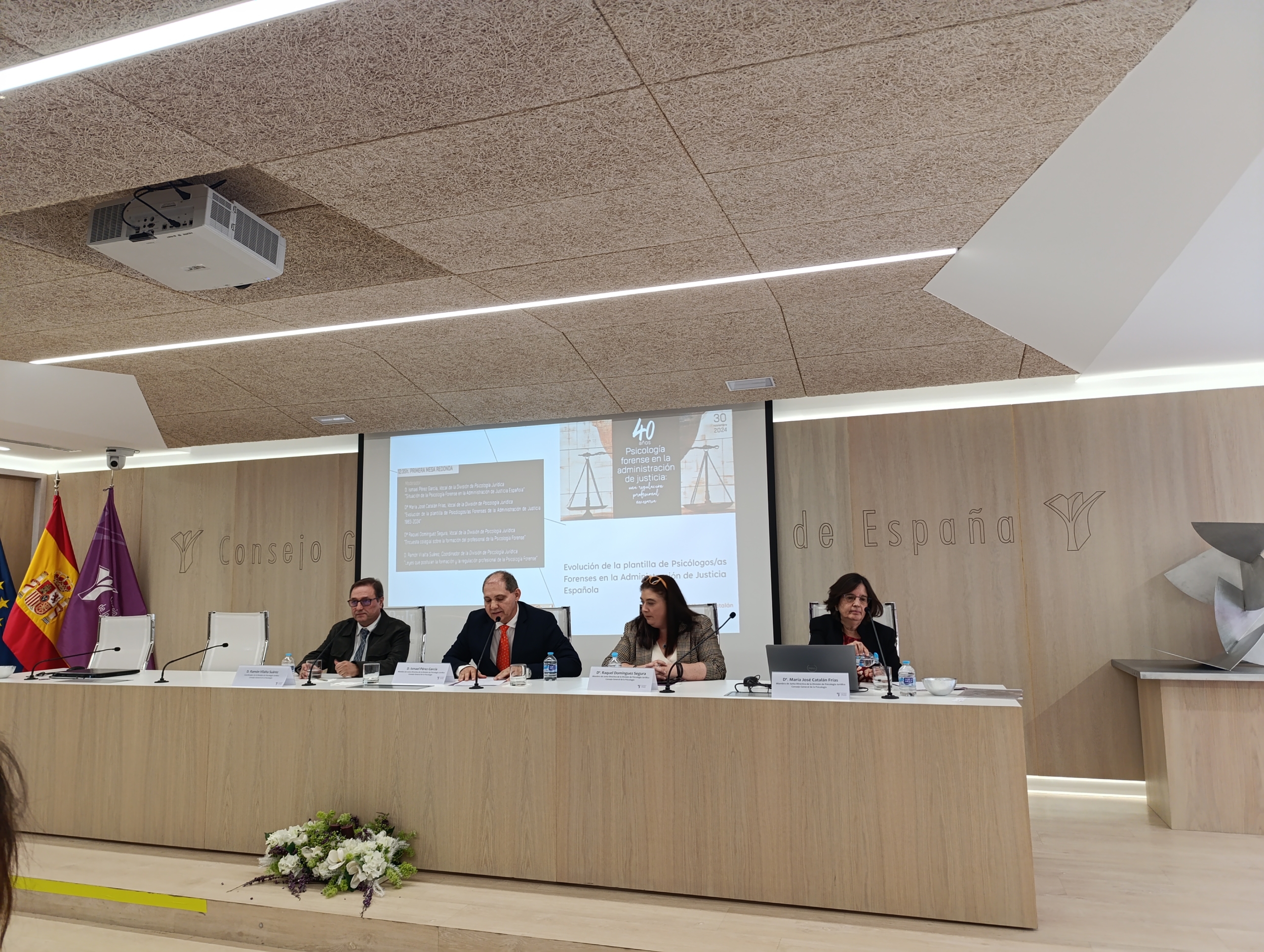 La Presentación del acto contó con la presencia del Presidente del Consejo General de la Psicología, Francisco Santaolaya Ochando, y a continuación se presentó la primera mesa redonda, en la que actuaron como ponentes los miembros de la Junta Directiva de la División de Psicología Jurídica, Ramón Vilalta, Mª José Catalán, Ismael Pérez y Raquel Domínguez, en la que expusieron la evolución de la plantillas de Psicólogos Forenses en la administración de justicia y la necesidad de ampliar plantillas; las leyes que postulan la formación y la regulación profesional de la Psicología Forense; así como una encuesta colegial sobre la formación necesaria de dichos profesionales.