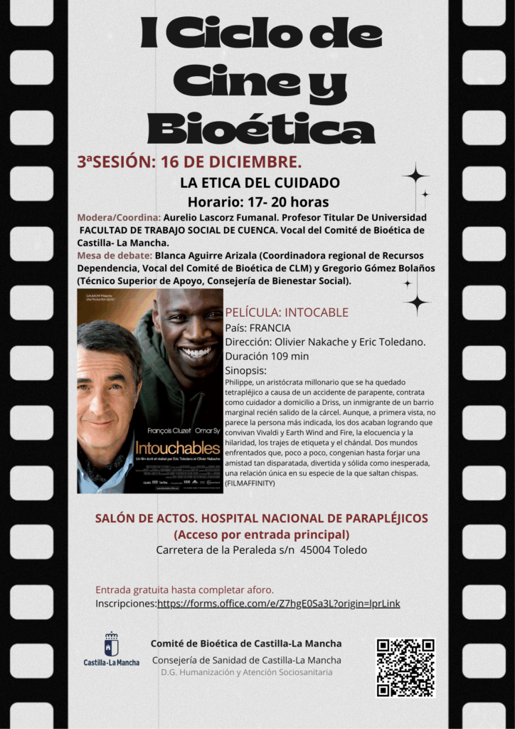 En la tercera sesión, que se celebrará el día 16 de diciembre, de 17:00 a 20:00 horas, la película para proyección y debate es “Intocable” de Olivier Nakache y Eric Toledano. En el debate se explorarán temas relacionados con la ética del cuidado.