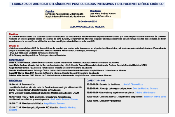 El martes 29 de octubre, el Aula Magna de la Facultad de Medicina de Albacete, acogerá la celebración, a partir de las 16:00 h., de la I Jornada de Abordaje del Síndrome Post-cuidados Intensivos y del Paciente Crítico Crónico, que organiza el Servicio de Anestesiología y Reanimación del Hospital General Universitario de Albacete.
