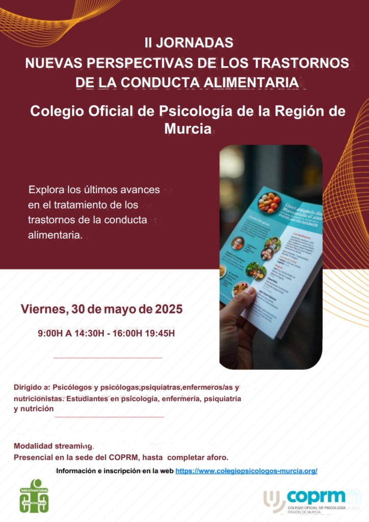 El Colegio Oficial de Psicología de la Región de Murcia (COPRM), organiza las, “II Jornadas Nuevas Perspectivas en el Abordaje de los Trastornos de la Conducta Alimentaria”, que se llevarán a cabo el viernes 30 de mayo de 2025 de 9:00h a 20:00h.
