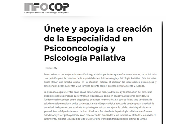 La publicación Infocop Online se ha hecho eco del apoyo del Consejo General de la Psicología de España a la puesta en marcha una recogida de firmas para apoyar la creación de la Especialidad de Psicooncología y Psicología Paliativa.