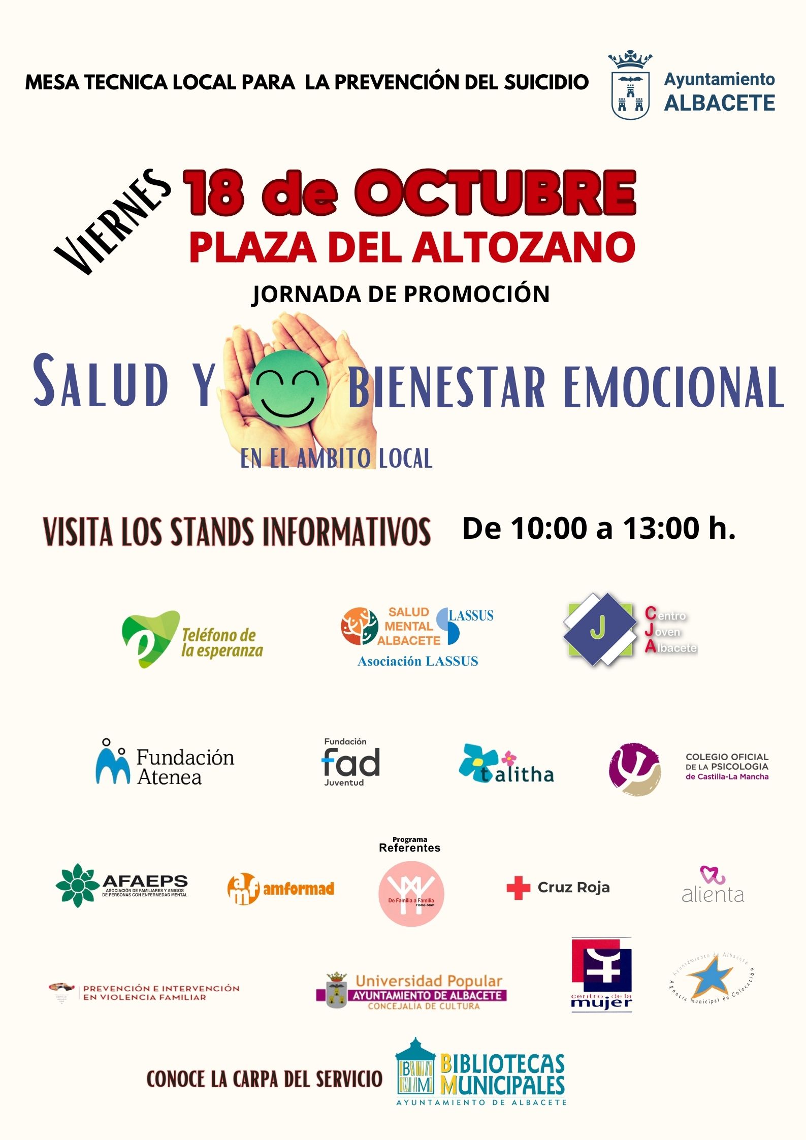 El viernes 18 de octubre, desde las 10:00 y hasta las 13:00 h., tendrá lugar en la Plaza del Altozano (Albacete), una Jornada de Promoción de la Salud y Bienestar Emocional en el Ámbito Local, organizada por la Mesa Técnica Local para la prevención del Suicidio, del Ayuntamiento de Albacete.