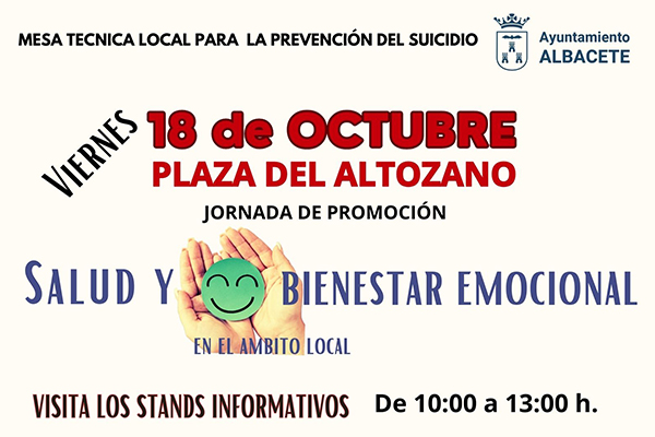 El viernes 18 de octubre, desde las 10:00 y hasta las 13:00 h., tendrá lugar en la Plaza del Altozano (Albacete), una Jornada de Promoción de la Salud y Bienestar Emocional en el Ámbito Local, organizada por la Mesa Técnica Local para la prevención del Suicidio, del Ayuntamiento de Albacete.