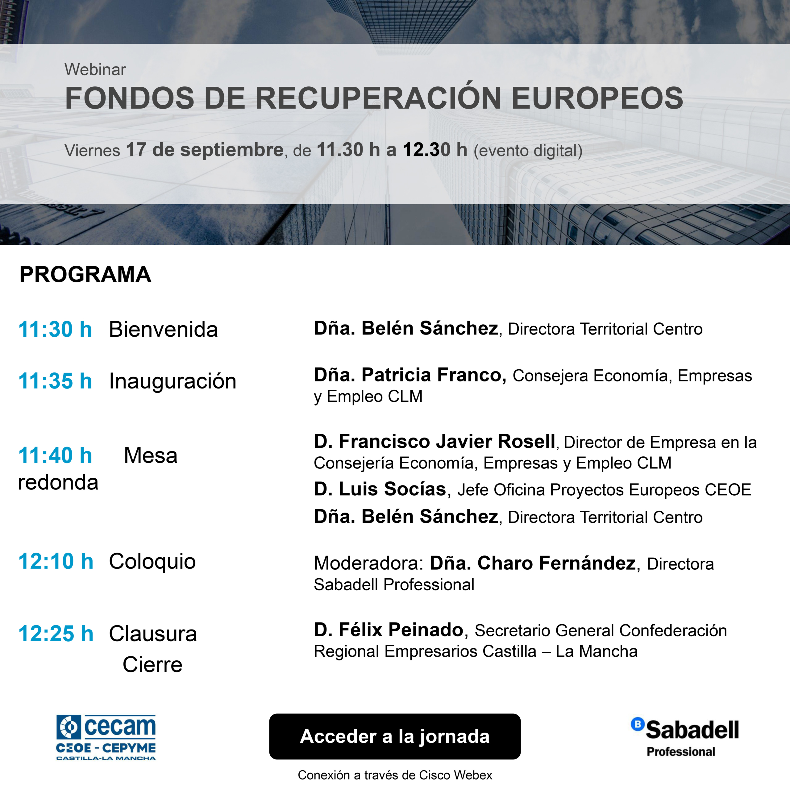 CECAM-CEOE CEPYME Castilla-La Mancha. conjuntamente con Banco Sabadell, en el marco del convenio de colaboración existente entre ambas entidades, celebran el próximo 17 de Septiembre, de 11.30 a 12.25h, una Mesa Redonda bajo el título: Jornada Virtual Fondos de Recuperación Europeos, con objeto de dar a conocer en qué consisten estos Fondos y qué posibles proyectos podrán acogerse a dichas ayudas para la recuperación y transformación económica.