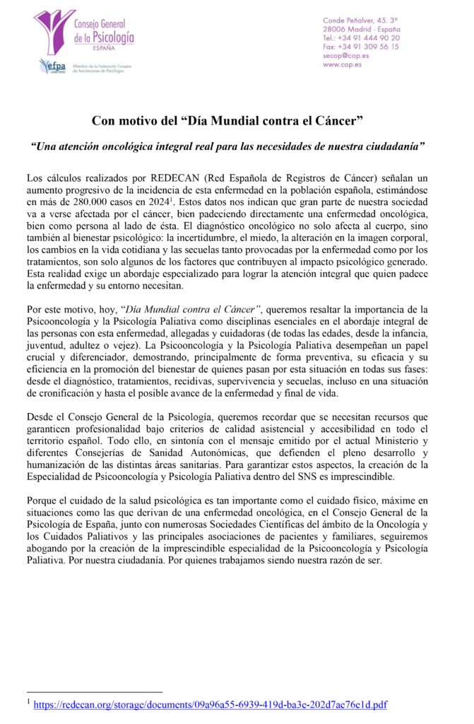 Este martes,4 de febrero, se conmemora el Día Mundial contra el Cáncer. En este contexto, la Junta Directiva de la División de Psicología de la Salud (PsiS) del Consejo General de la Psicología de España, ha elaborado el siguiente manifiesto.