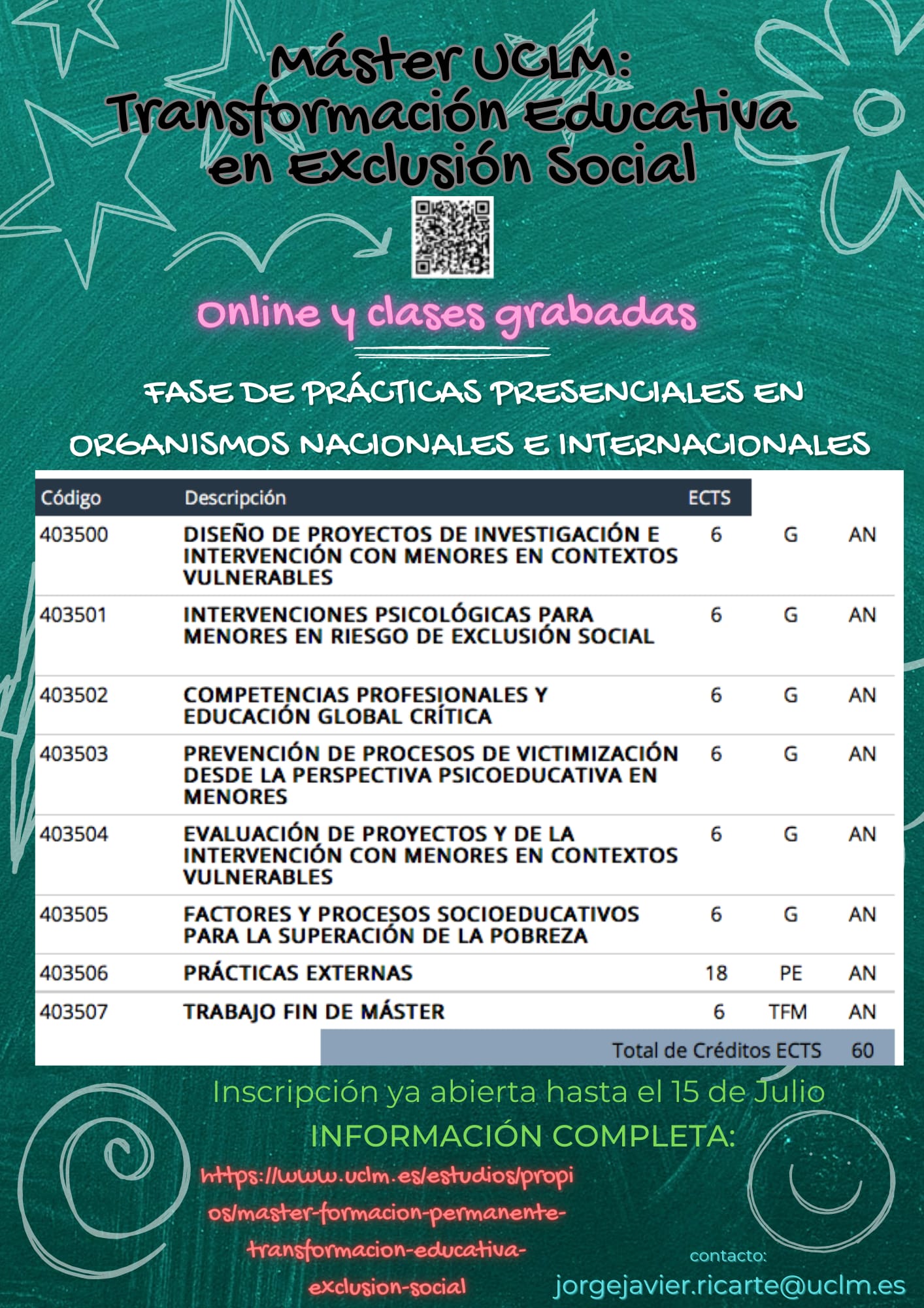 Tiene por objetivo desarrollar y reforzar conocimientos, habilidades, valores y actitudes para responder a las necesidades educativas y sociales de nuestra infancia y juventud, especialmente de aquellos menores en riesgo de exclusión social, abandono escolar y/o vulnerabilidad: menores no acompañados, inmigrantes, minorías étnicas o infancia en situación de pobreza, entre otros.