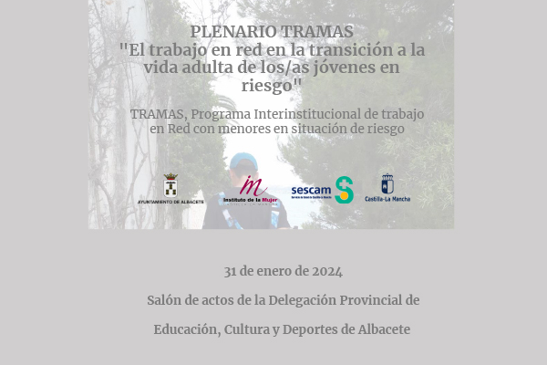 El miércoles 31 de enero de 2024, el Salón de actos de la Delegación Provincial de Educación, Cultura y Deportes de Albacete, acogerá la celebración del Plenario del Programa Tramas, bajo la denominación de “El trabajo en red en la transición a la vida adulta de los/as jóvenes en riesgo”