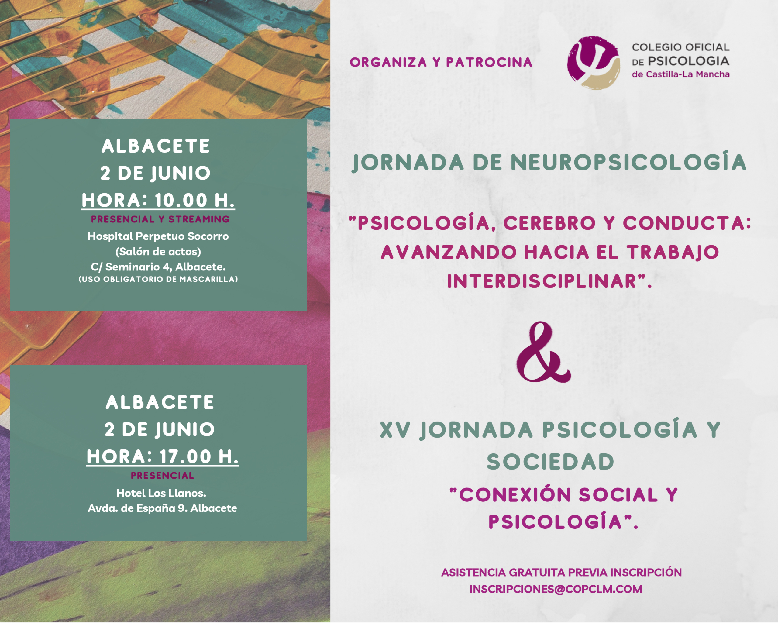 Publicamos el programa de la Jornada de Neuropsicología, que se desarrollará bajo el título “Psicología, cerebro y conducta: Avanzando hacia el trabajo interdisciplinar”, y de la XV Jornada de Psicología y Sociedad del Colegio Oficial de la Psicología de Castilla-La Mancha, que en esta edición se ha venido a denominar “Conexión social y Psicología”.