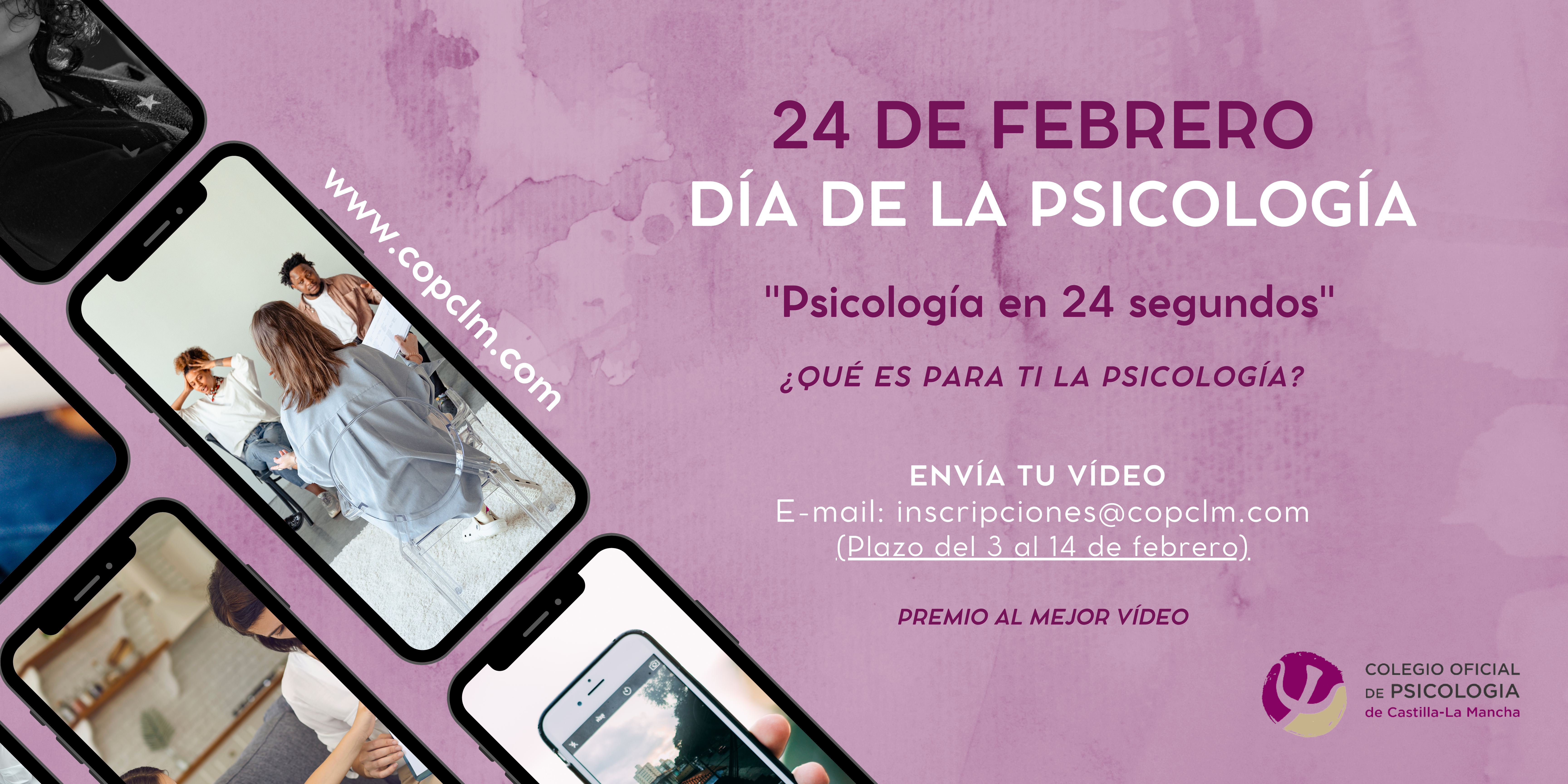Envía tu vídeo con una duración máxima de 24 segundos a la dirección de correo electrónico inscripciones@copclm.com ¿Qué es para ti la Psicología?. Se publicarán en la web y en las redes sociales del Colegio Oficial de la Psicología de Castilla-La Mancha, y pueden participar las personas mayores de edad, previa autorización de difusión de su imagen a nivel público.