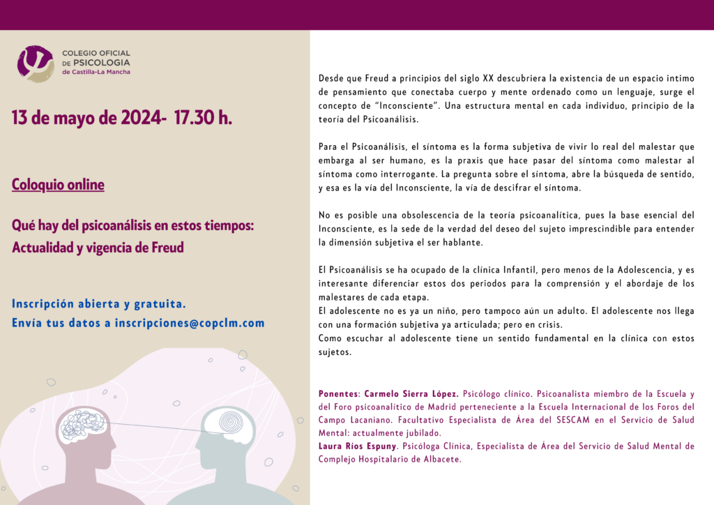Dentro de las actividades programadas en el Plan de Formación 2023-2024 del Colegio Oficial de la Psicología de Castilla-La Mancha, el lunes 13 de mayo de 2024, a las 17:30 horas, tendrá lugar el Coloquio denominado “Qué hay del psicoanálisis en estos tiempos: Actualidad y vigencia de Freud”.