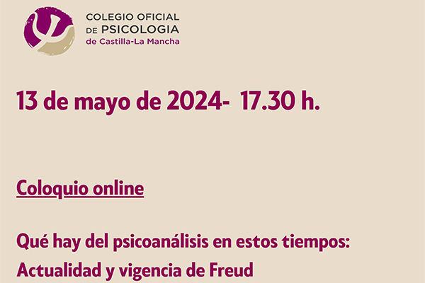 Dentro de las actividades programadas en el Plan de Formación 2023-2024 del Colegio Oficial de la Psicología de Castilla-La Mancha, el lunes 13 de mayo de 2024, a las 17:30 horas, tendrá lugar el Coloquio denominado “Qué hay del psicoanálisis en estos tiempos: Actualidad y vigencia de Freud”.