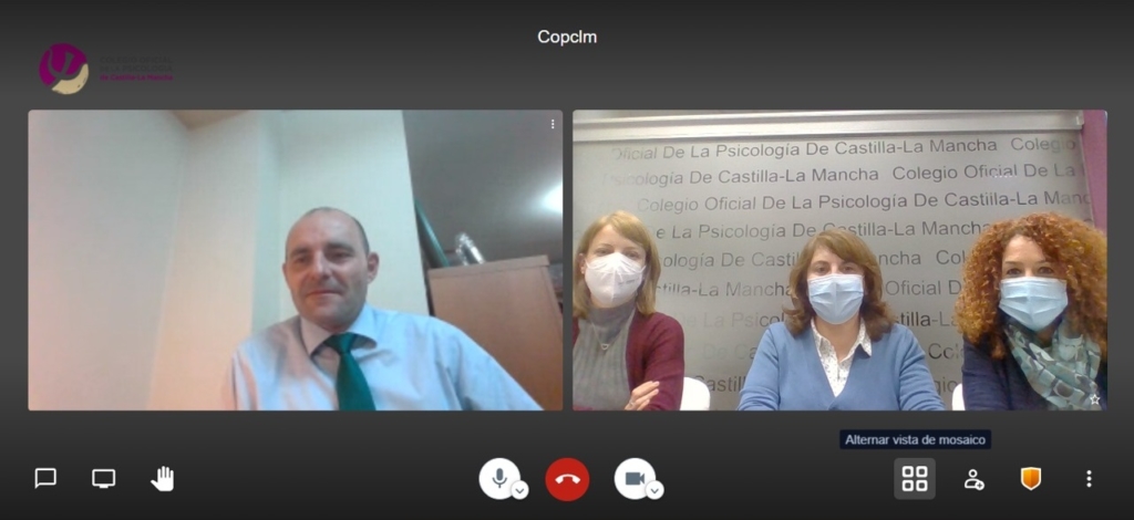 El pasado martes, 23 de febrero, se llevó a cabo un encuentro por vídeo conferencia en el que participaron María Dolores Gómez Castillo, María del Mar Aguilar, y Beatriz Navarro, Decana, Secretaria y Vicesecretaria del COPCLM, respectivamente, y Alino José Martínez Marcos, Vicerrector de Ciencias de la Salud de la Universidad de Castilla-La Mancha.
