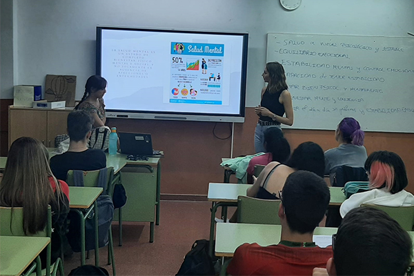 Arantxa Andreoli Egea, Blanca Serrano Fernández, Irene Pérez De Lara Rueda y Sandra Romero Velasco, residentes de Psicología Clínica en la Gerencia de Atención Integrada de Albacete fueron las encargadas de trasladar, a un número de alrededor de 110 alumnos y alumnas de 4º de ESO del IES Diego de Siloé, en Albacete, los conceptos de la charla “Cómo la Psicología ayuda a resolver tus problemas. Prevención y promoción de la salud psicológica en la adolescencia”.