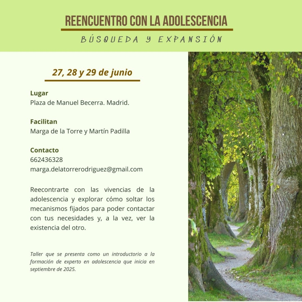 Un espacio donde poder iniciar un reencuentro con la adolescencia en compañía de dos terapeutas durante el fin de semana.