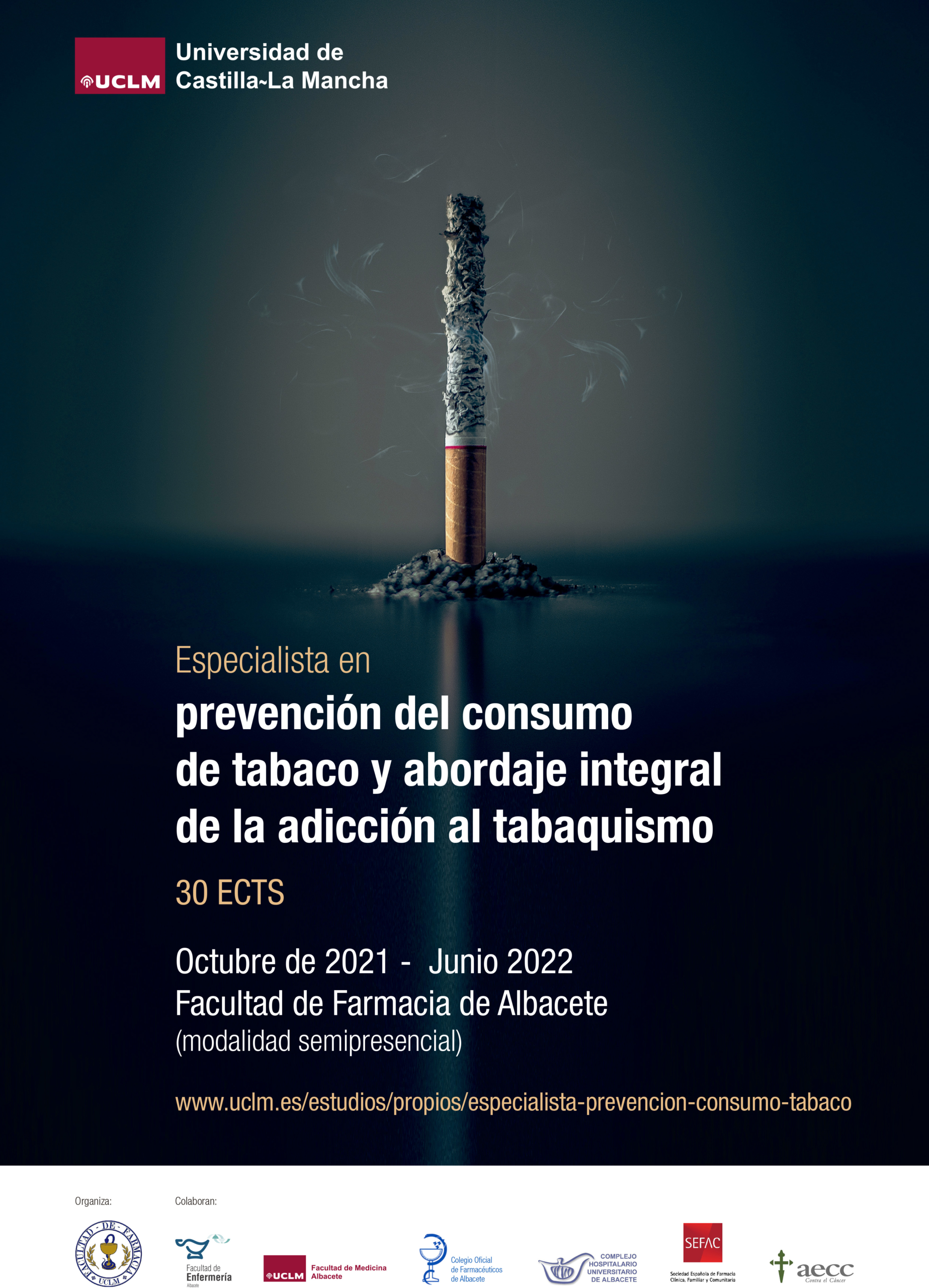 La Universidad de Castilla-La Mancha ha puesto en marcha la 1ª edición del Título de Especialista en Prevención del Consumo de Tabaco y Abordaje Integral de la Adicción al Tabaquismo, que se celebrará entre octubre de 2021 y junio de 2022, y en cuya organización ha colaborado el Colegio de Farmacéuticos y SEFAC.