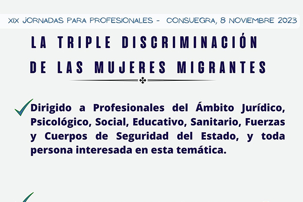 En esta ocasión se celebran las XIX Jornada de Formación para profesionales, cuyo objeto será: “La triple discriminación de las mujeres migrantes”.